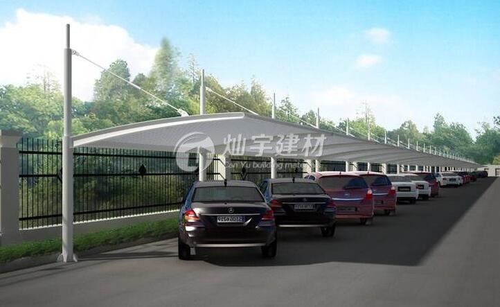 膜結構車棚的篷布材質是膜材,而膜材的大特點是強度高、耐久性好、防火難燃、自潔性好,不受紫外線影響,使用壽命長,一般15-30年。具有高透光率,透光率為13%,對熱能反射率73%,熱吸收量很少。正是因為這種劃時代的膜材料的發明,使膜結構車棚成為現代化的建筑。